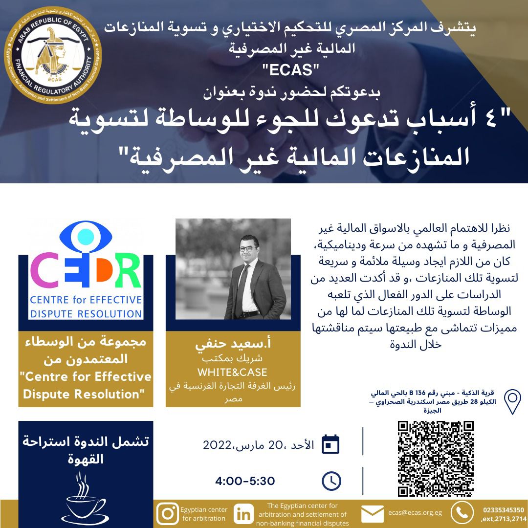 يتشرف المركز المصري للتحكيم الاختياري وتسوية المنازعات المالية غير المصرفية (ECAS) بدعوة حضراتكم لحضور ندوة بعنوان (4 اسباب تدعوك للجوء للوساطة لتسوية المنازعات المالية غير المصرفية) وذلك نظراً للاهتمام العالمي بالاسواق المالية غير المصرفية وما تشهدة من سرعة وديناميكية كان من اللازم ايجاد وسيلة ملائمة وسريعة لتسوية تلك المنازعات وقد اكدت العديد من الدراسات علي الدور الفعال الذي تلعبة الوساطة لتسوية تلك المنازعات لما لها من مميزات تتماشي مع طبيعتها سيتم مناقشتها خلال الندوة، وذلك يوم الأحد الموافق 20 مارس 2022 في تمام الساعة الرابعة مساءً بمقر الهيئة العامة للرقابة المالية.